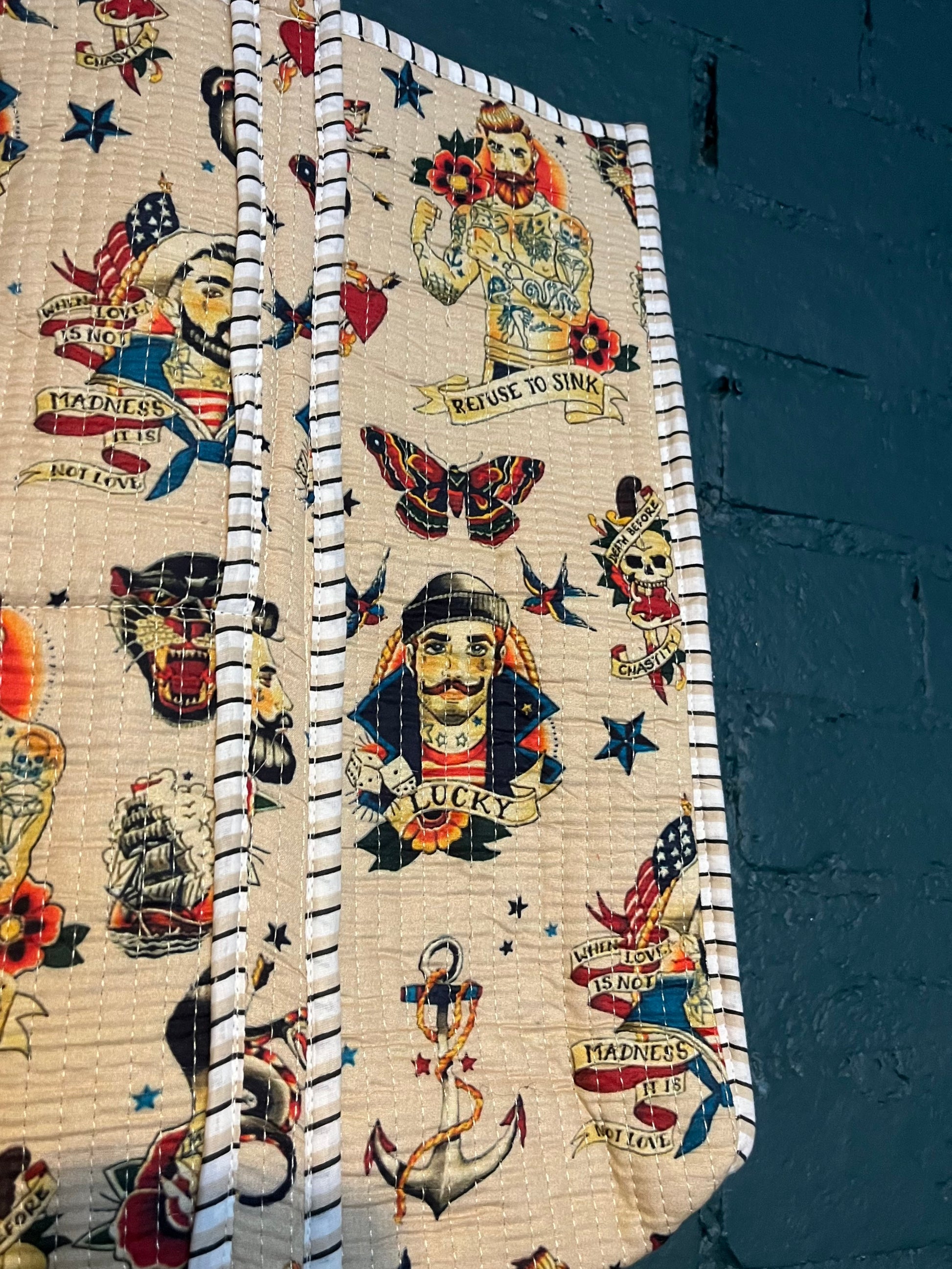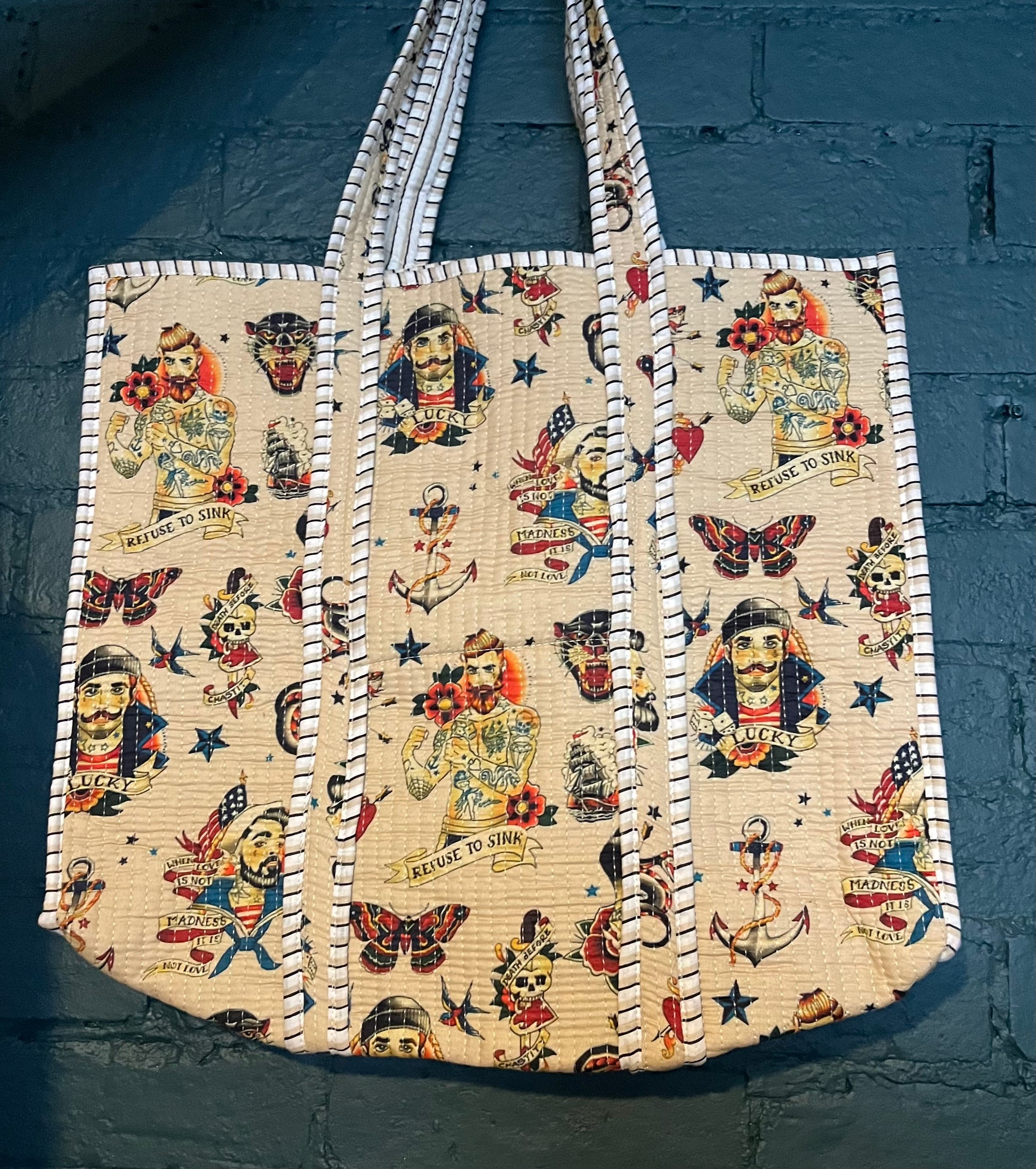 Our one of a kind sailor tote! Reversible, 100% cotton and machine washable on cool setting.